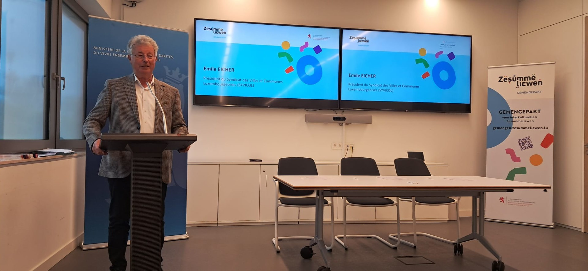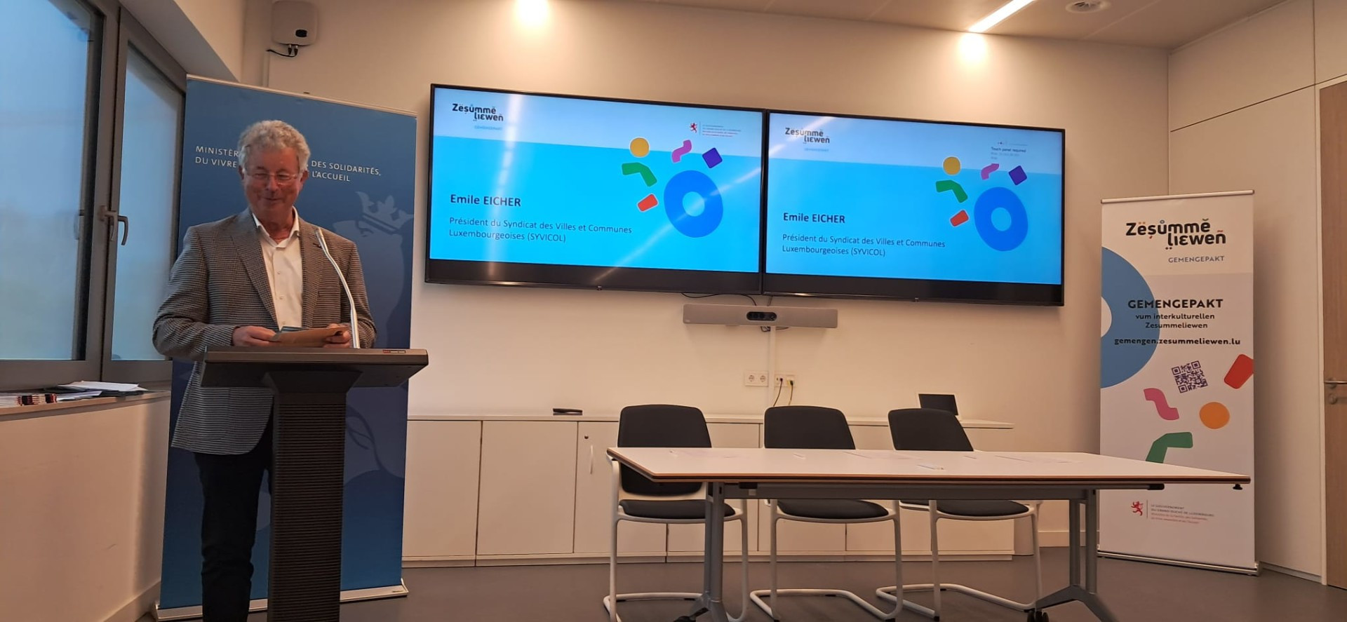 Après un discours introductoire du Ministre Max Hahn, dans lequel il a remercié les responsables politiques des 9 communes présentes pour leur engagement en faveur du vivre-ensemble interculturel et pour leur reconnaissance de la diversité comme une richesse et un atout pour la société luxembourgeoise, M. Eicher a de même félicité celles-ci et a fait mention au besoin d’une société davantage solidaire et inclusive, la signature du « Gemengepakt » étant un moyen pour les communes de se pencher d’autant plus sur cette tâche, avec le soutien du Ministère de la Famille, des Solidarités, du Vivre ensemble et de l'Accueil. Il a aussi remercié le ministère pour les initiatives visant à promouvoir l’intégration des personnes âgées et leur participation active à la vie communautaire, comme le Forum du troisième âge, qui aura lieu le 25 octobre à Strassen et auquel M. Eicher participera également.