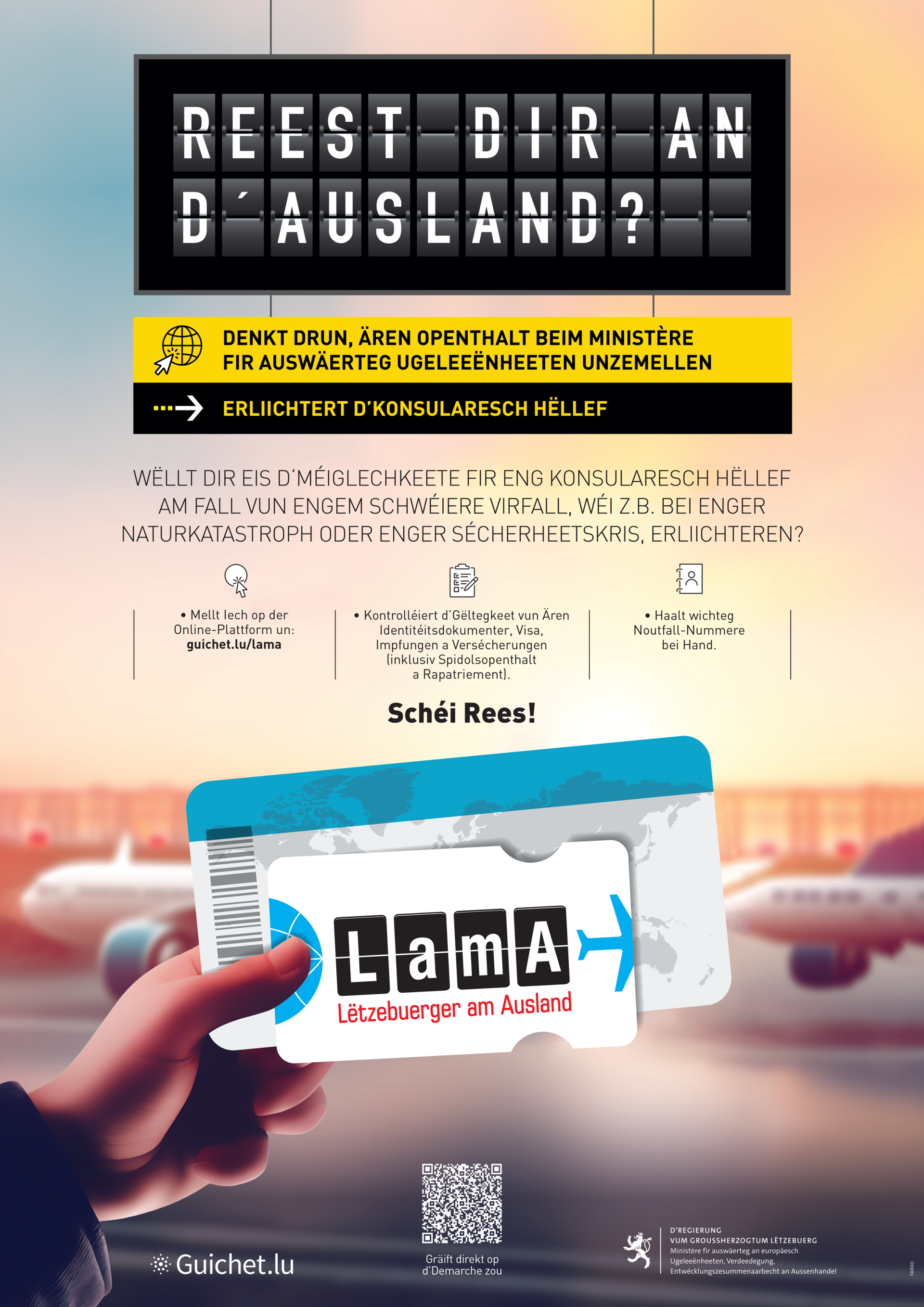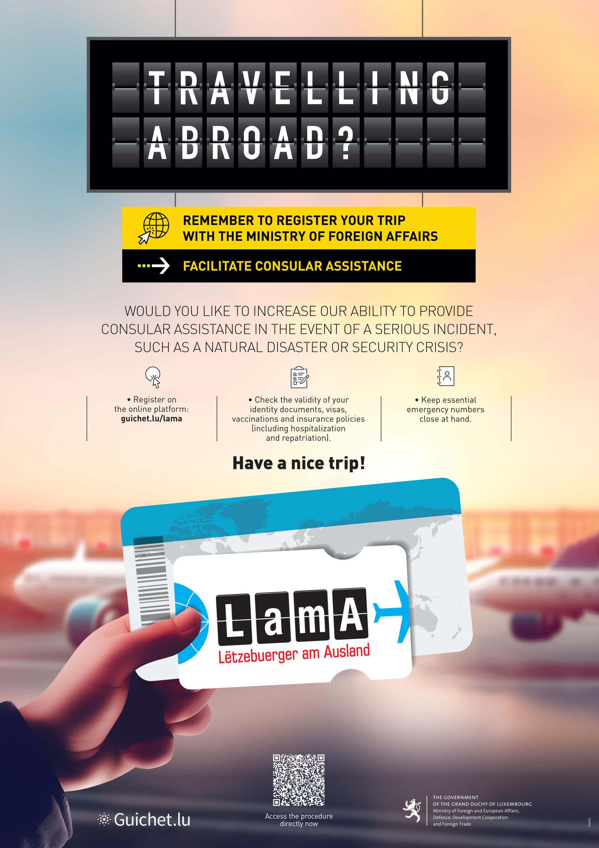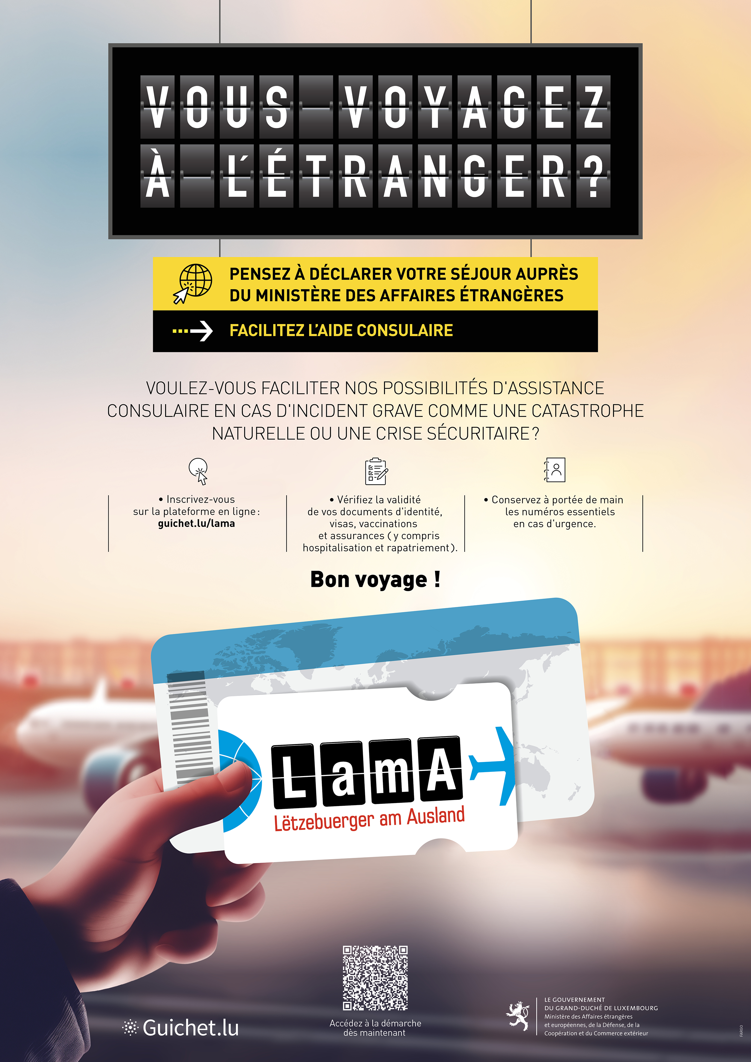 Dans le cadre de sa mission d’assistance consulaire, le ministère des Affaires étrangères et européennes, de la Défense, de la Coopération et du Commerce extérieur (MAE) met à disposition des citoyens luxembourgeois la plateforme Lëtzebuerger am Ausland (LamA).